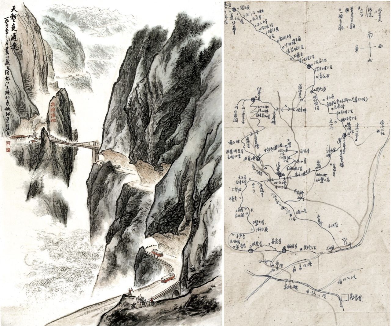 左图:姚耕云《天堑变通途》(画稿),210 cm×145 cm,1966 年。右图:1965 年姚耕云《手绘路线图》。受访者供图