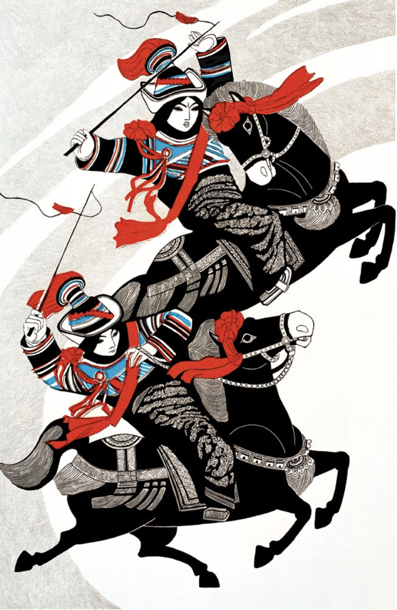 牛文《跑马图》,套色木刻,1985 年。受访者供图