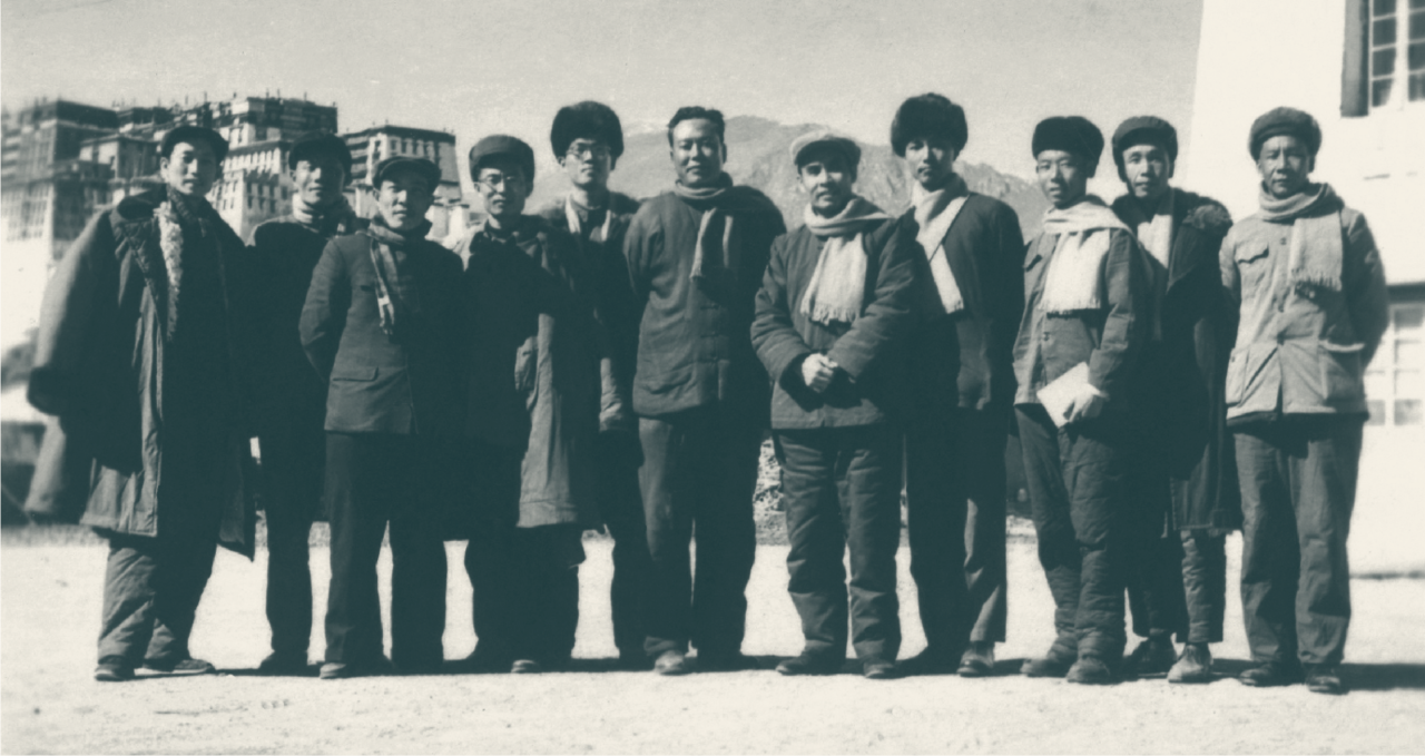 随中央代表团入藏的7位艺术家合影:刘济荣(左四)、杜英信(左五)、牛文(中)、姚耕云(右四)、其加达瓦(右三)、梁世雄(右二)、李焕民(右一)。受访者供图