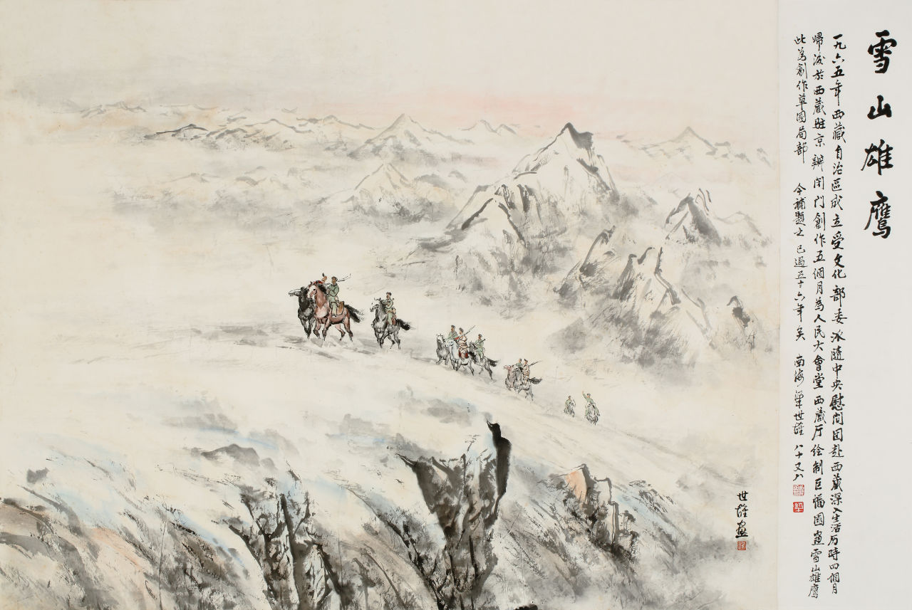 在藏北牧区,梁世雄体验了骑马,一开动骑得很慢,眼看太阳快下山了,他试着加速速率,班师赶回。从此,他对马很有心理,画了不少马的速写,并收拢了画马的精髓——证明腿部的灵动感。他的主题画作《雪山雄鹰》便是展示藏族民兵骑马巡缉。