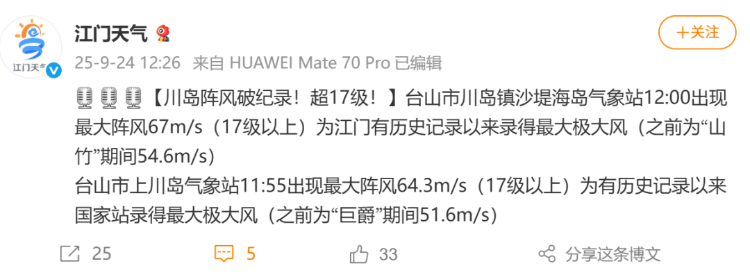 9月24日12时,江门台山市川岛镇沙堤海岛形态站出现最大阵风67m/s(17级以上),为江门有历史记载以来录得最大极大风(之前为“山竹”技术54.6m/s)。