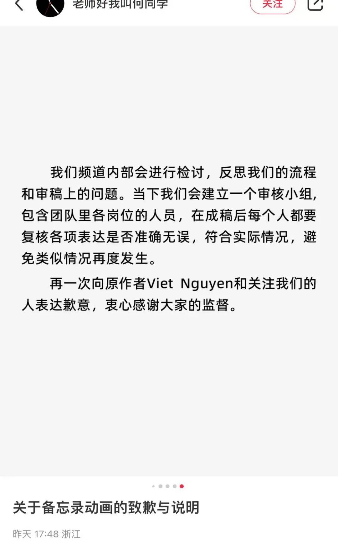 11月21日下昼5时许,何同学发布了《对于备忘录动画的致歉与诠释》,注视诠释了其视频《我用36万行备忘录作念了个动画……》的抄袭风云,并在其中诠释注解了“为何删除原作家名字”以及“是否删除作家挑剔”等争议。